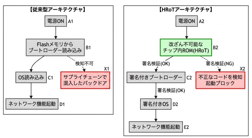 この物理的なサプライチェーンの排除と同時に、技術的な解決策として今後のエコシステムで優位性を持つのが**「Hardware Root of Trust (HRoT:ハードウェア・ルート・オブ・トラスト)」**というアーキテクチャです。