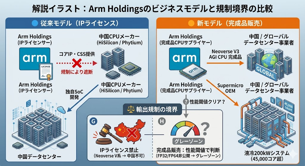 ここが本ニュースの核心的な論点となる。現行の米英輸出規制は、半導体の「IPおよびデザインデータの移転」と「完成品半導体の販売」を区別している。Arm AGI CPUは完成品チップであるため、規制対象はIPの移転ではなく、性能閾値(絶対性能、演算密度、インターコネクト帯域など)によって判断される。Armは現時点でFP32/FP64スループットを非公開としており、Tom’s Hardwareも「FLOPS推定値は推論にすぎず、規制閾値との正確な比較は不可能」と指摘している。