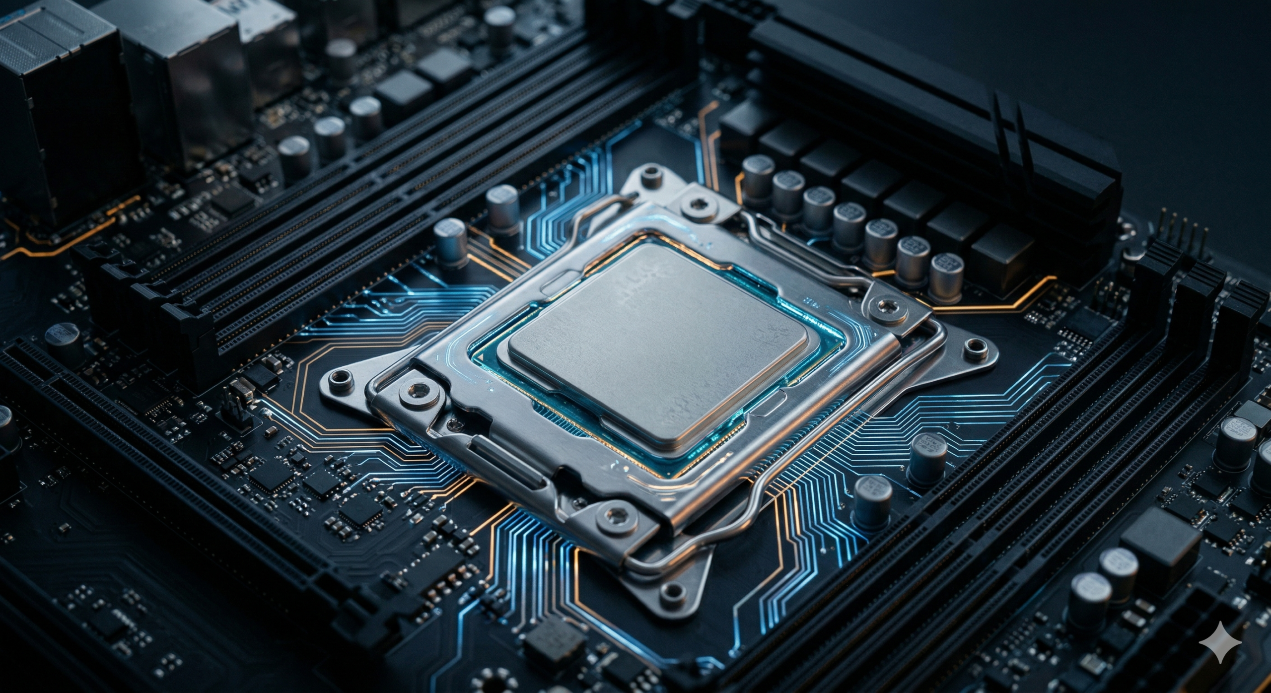 【アイキャッチ画像用プロンプト】 A photorealistic close-up of a high-end server CPU chip mounted on a motherboard, surrounded by glowing circuit traces in cool blue and warm amber tones, dark studio background, no text, no labels, cinematic lighting with shallow depth of field