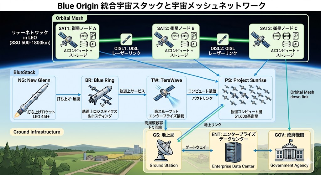 Blue Originは51,600基の衛星を宇宙空間に展開し、AIワークロード向け分散型軌道データセンター「Project Sunrise」を構築する計画を発表した。光学間衛星リンク(OISL)によるレーザー通信メッシュと太陽同期軌道の活用により、衛星を「通信パイプ」から「宇宙コンピュート基盤」へと再定義する。これはSpaceXとの衛星インターネット競争を超え、宇宙インフラそのものを次世代AIのコンピュート層として取り込む長期的な産業変革の号砲だ。