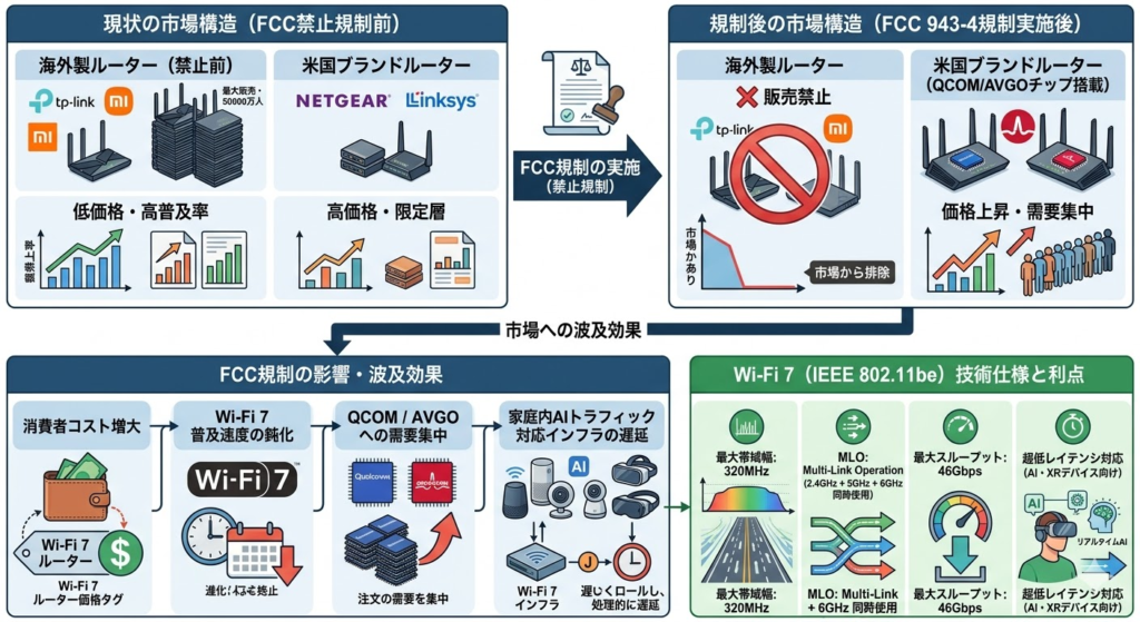 FCCによる海外製Wi-Fiルーター禁止措置は、表面上は安全保障政策だが、その実態は家庭用ネットワーク市場のサプライチェーン再編と価格構造の根本的な変化を強制するものだ。Wi-Fi 7という技術的ポテンシャルが最高潮に達しつつある今、規制による普及速度の鈍化は「技術の進化」と「政策の制約」が真正面から衝突する構図を生み出している。