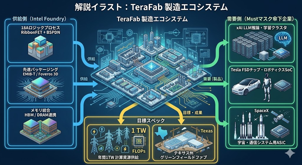 - IntelがイーロンマスクのTeraFabプロジェクトに正式参画し、ロジック・メモリ・先進パッケージングの垂直統合による年間1テラワット(1 TW/year)の計算資源供給という前例のない目標に向けてIntel Foundryのリソースを投入する