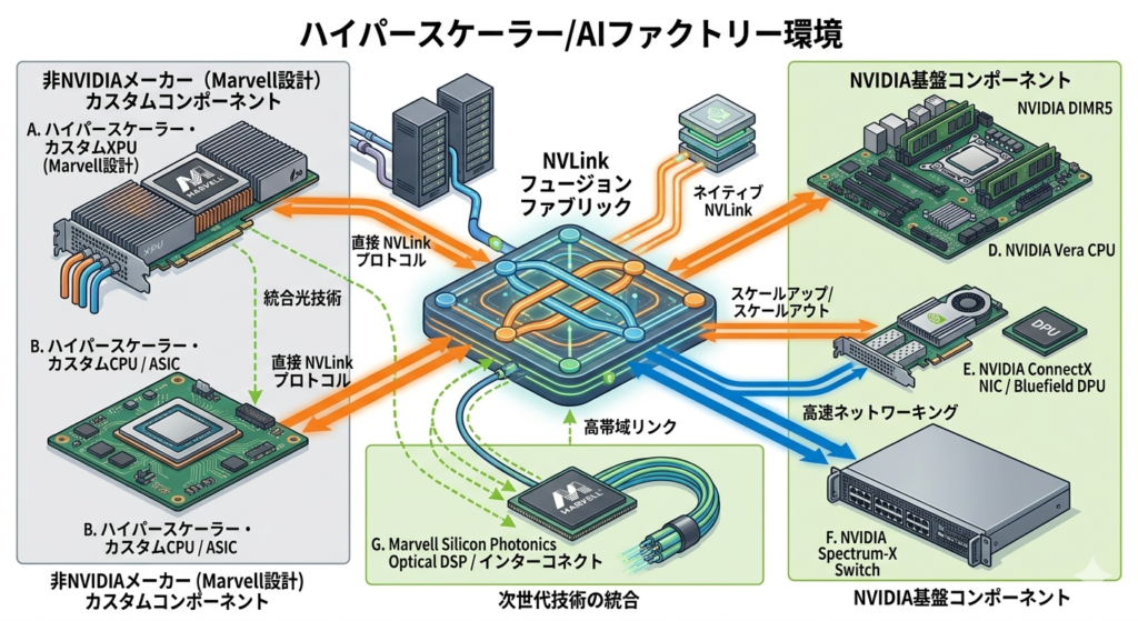 Marvell側は、各ハイパースケーラーの要件に特化した「カスタムXPU」と、先日買収したCelestial AIの技術を活かした「高速なシリコンフォトニクス(光電融合)インターコネクト」を提供します。対するNVIDIA側は、「Vera CPU」「ConnectX NIC」「Bluefield DPU」「Spectrum-Xスイッチ」、そしてインフラの背骨となる「NVLinkファブリック」を供給します。