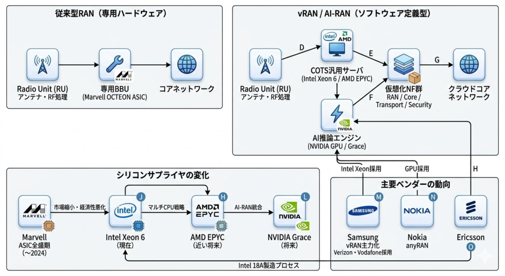 - これは無線通信インフラが専用ハードウェア(ASIC)依存から、仮想化・ソフトウェア定義型(vRAN)へと完全にパラダイムシフトしたことを意味する。
