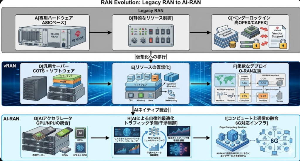 この発表が意味する最大の技術的優位性は、通信インフラの「ソフトウェア化(vRAN)」から「インテリジェント化(AI-RAN)」への不可逆的なシフトです。